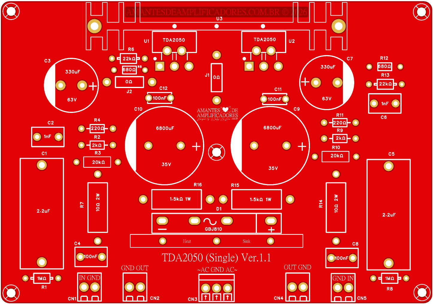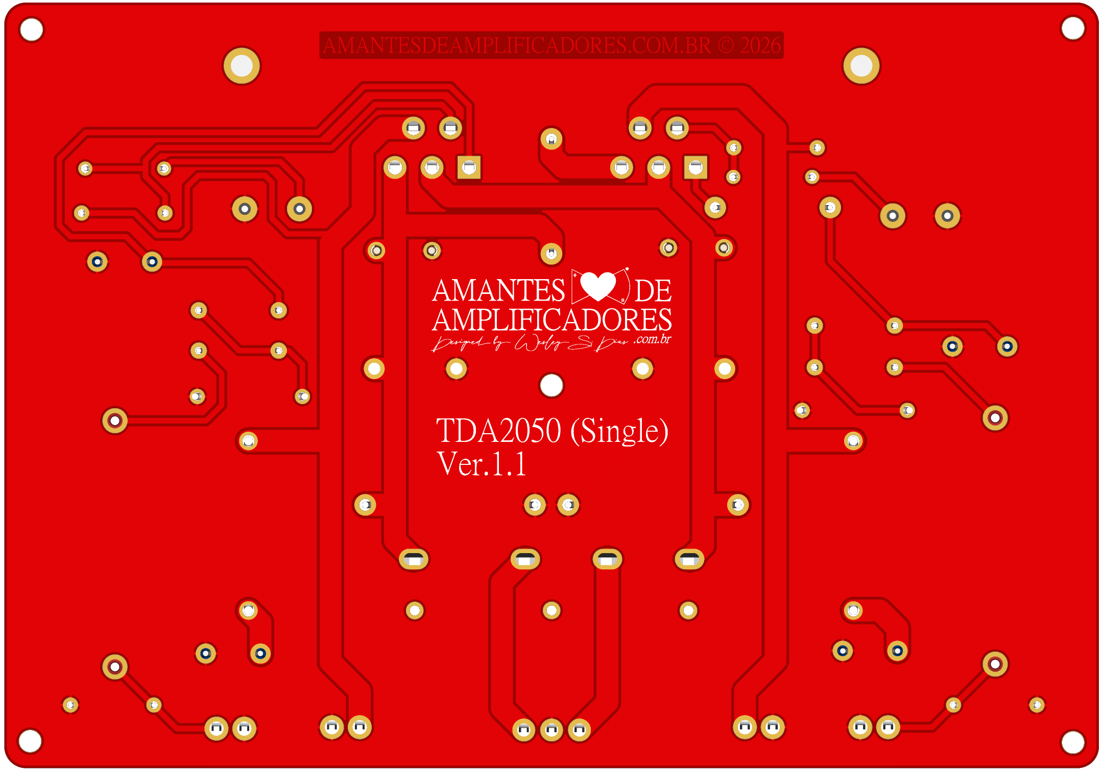 Veja a seguir o layout da placa pcb do amplificador tda2050 stereo: