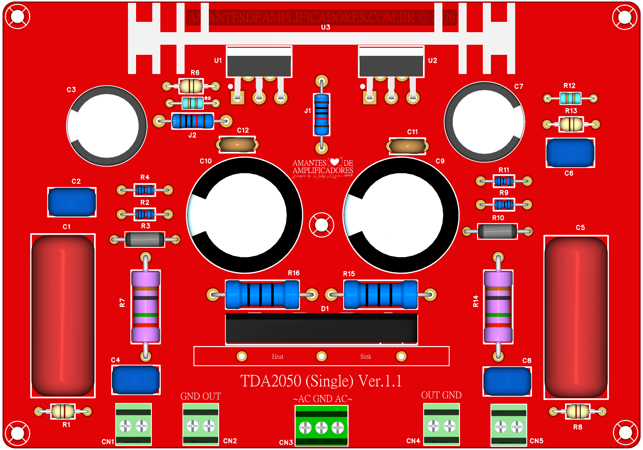 De acordo com o artigo posterior do amplificador tda 2050 (single), esta placa com circuito amplificador tda2050 stereo conta com fonte simétria integrada, ideal para montar um amplificador caseiro de 100W de alta qualidade, pequeno e potente com poucos componentes.